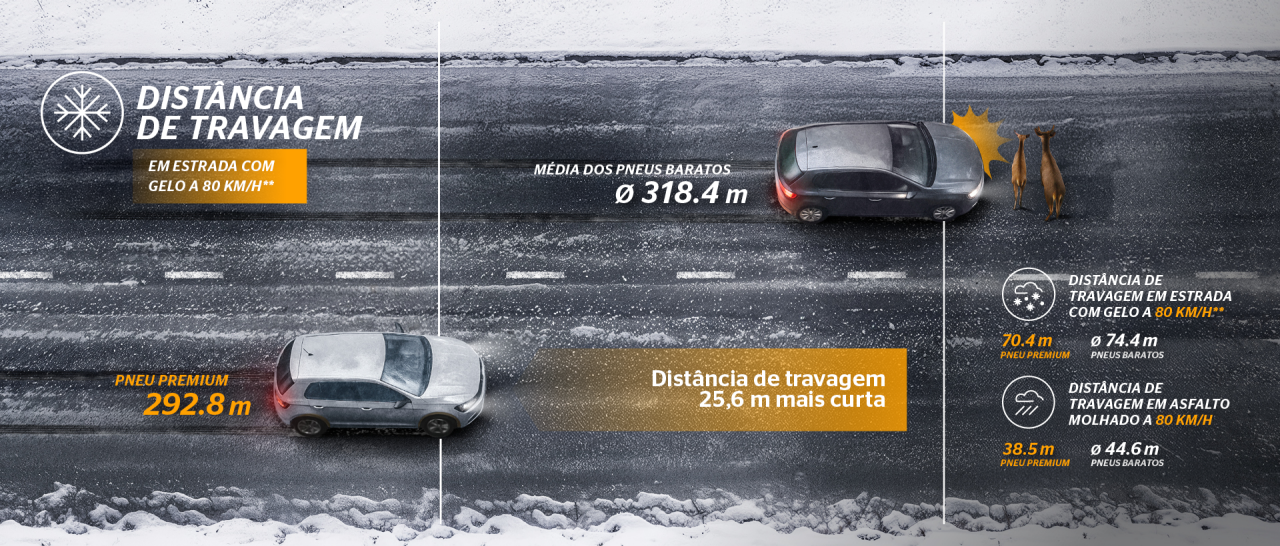 Os pneus premium oferecem o controlo de que precisa — mesmo quando a estrada está escorregadia ou surgem imprevistos. As opções mais económicas podem pô-lo a andar, mas nem sempre o levam em segurança até ao destino! Os pneus premium estão consigo quando realmente importa.
