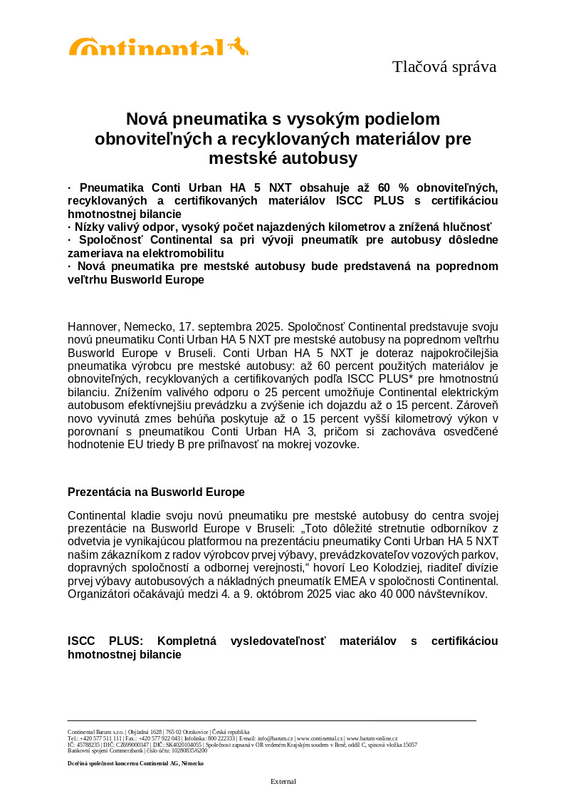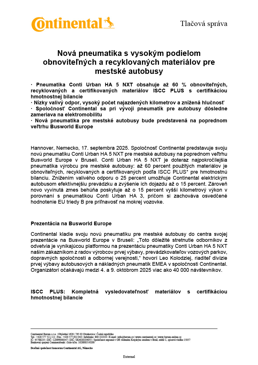 Hannover, Nemecko, 17. septembra 2025. Spoločnosť Continental predstavuje svoju novú pneumatiku Conti Urban HA 5 NXT pre mestské autobusy na poprednom veľtrhu Busworld Europe v Bruseli. Conti Urban HA 5 NXT je doteraz najpokročilejšia pneumatika výrobcu pre mestské autobusy: až 60 percent použitých materiálov je obnoviteľných, recyklovaných a certifikovaných podľa ISCC PLUS* pre hmotnostnú bilanciu. Znížením valivého odporu o 25 percent umožňuje Continental elektrickým autobusom efektívnejšiu prevádzku a zvýšenie ich dojazdu až o 15 percent. Zároveň novo vyvinutá zmes behúňa poskytuje až o 15 percent vyšší kilometrový výkon v porovnaní s pneumatikou Conti Urban HA 3, pričom si zachováva osvedčené hodnotenie EU triedy B pre priľnavosť na mokrej vozovke.