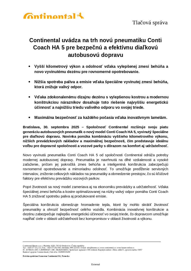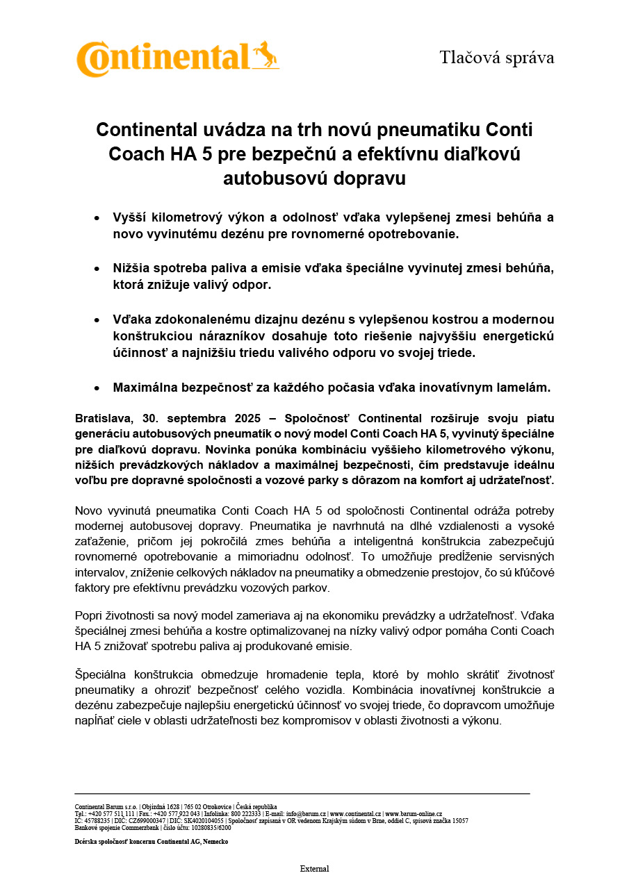 Bratislava, 30. septembra 2025 – Spoločnosť Continental rozširuje svoju piatu generáciu autobusových pneumatík o nový model Conti Coach HA 5, vyvinutý špeciálne pre diaľkovú dopravu. Novinka ponúka kombináciu vyššieho kilometrového výkonu, nižších prevádzkových nákladov a maximálnej bezpečnosti, čím predstavuje ideálnu voľbu pre dopravné spoločnosti a vozové parky s dôrazom na komfort aj udržateľnosť.