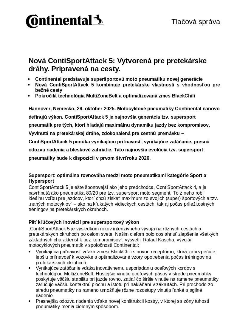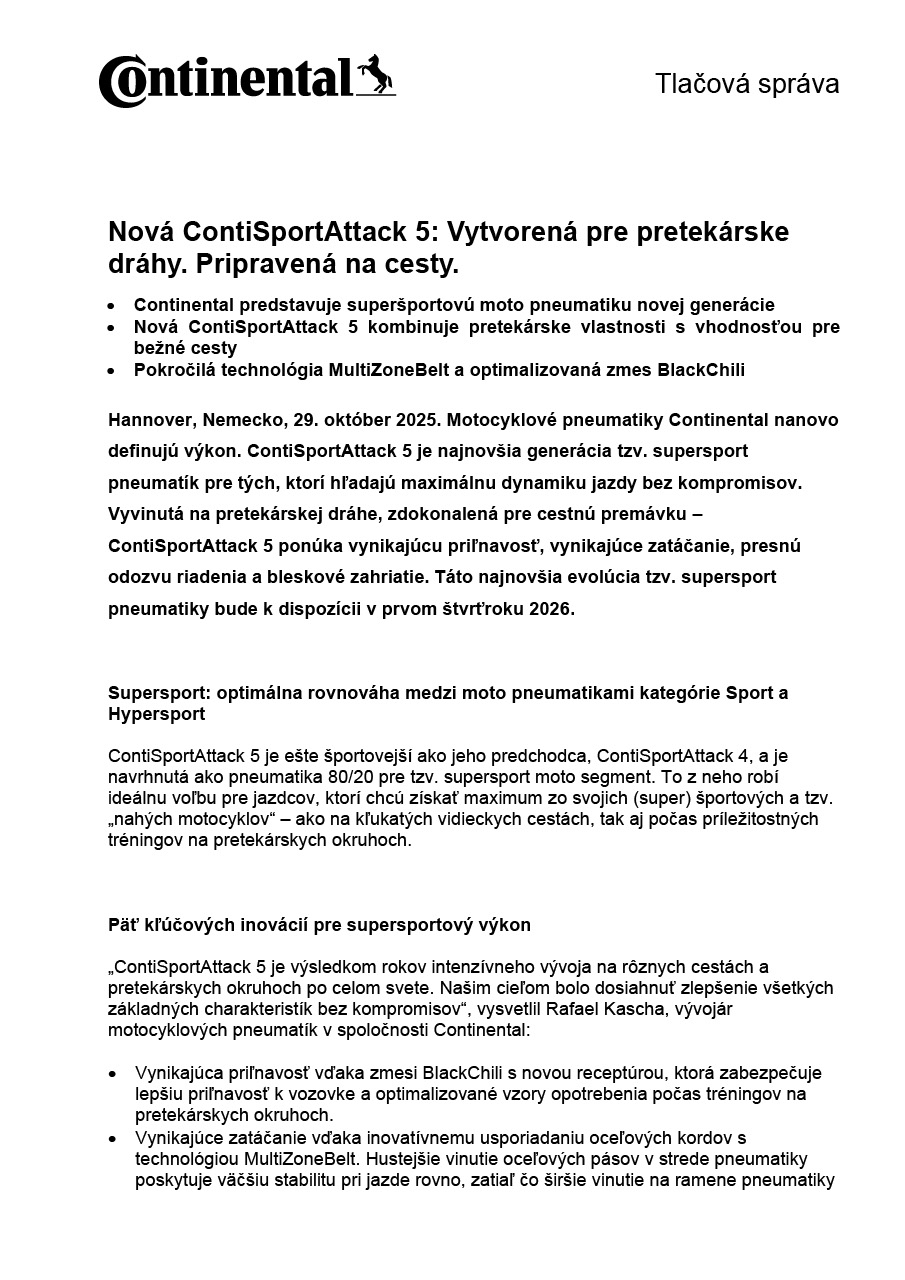 Hannover, Nemecko, 29. október 2025. Motocyklové pneumatiky Continental nanovo definujú výkon. ContiSportAttack 5 je najnovšia generácia tzv. supersport pneumatík pre tých, ktorí hľadajú maximálnu dynamiku jazdy bez kompromisov. Vyvinutá na pretekárskej dráhe, zdokonalená pre cestnú premávku – ContiSportAttack 5 ponúka vynikajúcu priľnavosť, vynikajúce zatáčanie, presnú odozvu riadenia a bleskové zahriatie. Táto najnovšia evolúcia tzv. supersport pneumatiky bude k dispozícii v prvom štvrťroku 2026.