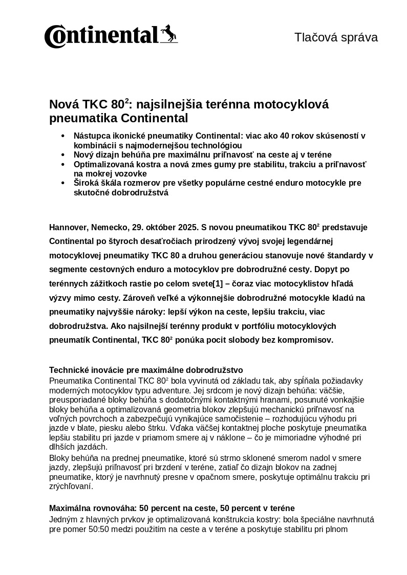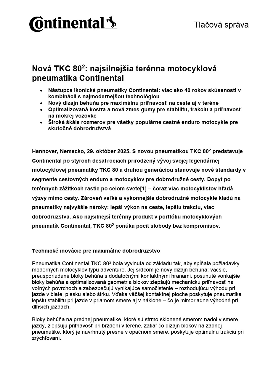 Hannover, Nemecko, 29. október 2025. S novou pneumatikou TKC 802 predstavuje Continental po štyroch desaťročiach prirodzený vývoj svojej legendárnej motocyklovej pneumatiky TKC 80 a druhou generáciou stanovuje nové štandardy v segmente cestovných enduro a motocyklov pre dobrodružné cesty. Dopyt po terénnych zážitkoch rastie po celom svete[1] – čoraz viac motocyklistov hľadá výzvy mimo cesty. Zároveň veľké a výkonnejšie dobrodružné motocykle kladú na pneumatiky najvyššie nároky: lepší výkon na ceste, lepšiu trakciu, viac dobrodružstva. Ako najsilnejší terénny produkt v portfóliu motocyklových pneumatík Continental, TKC 802 ponúka pocit slobody bez kompromisov.