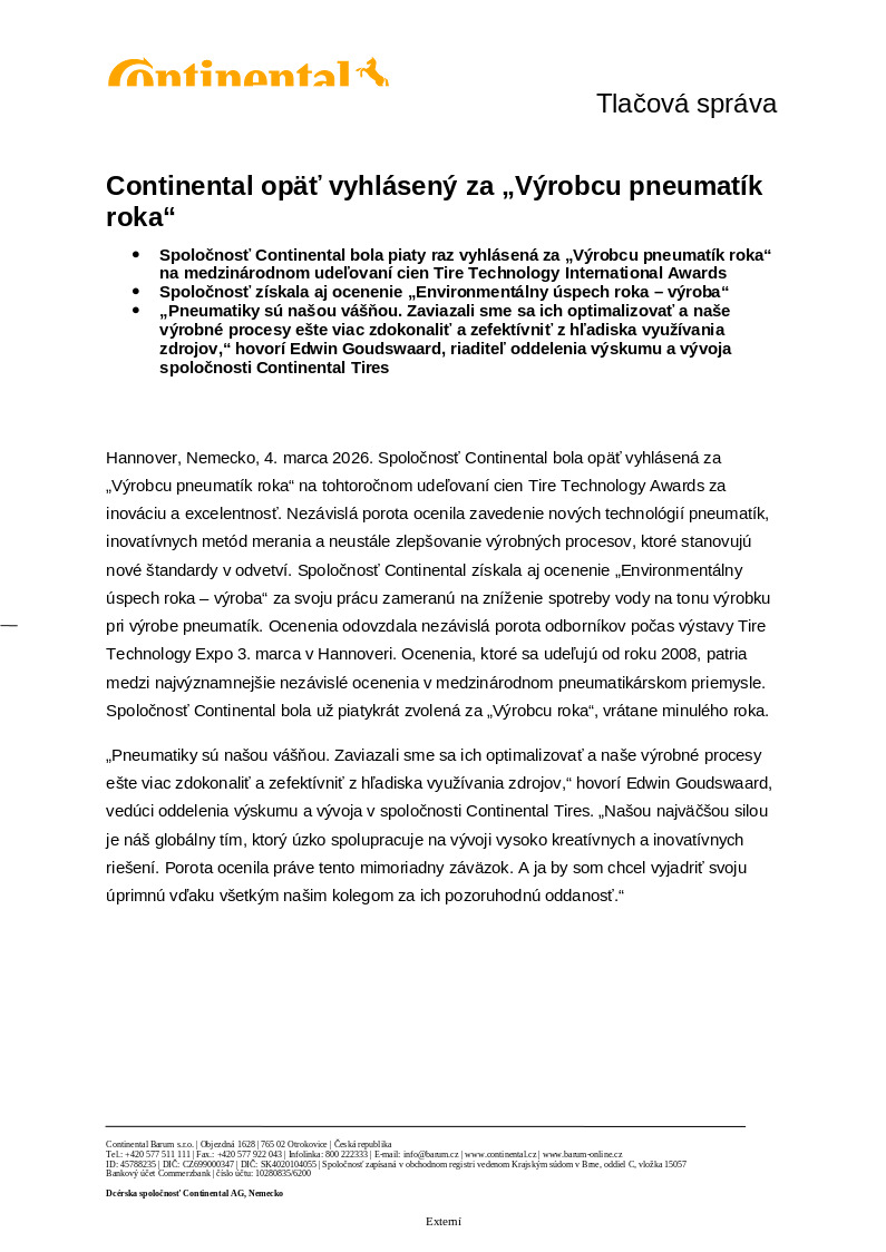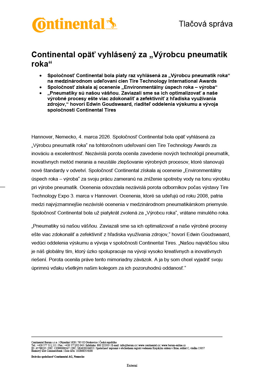 Hannover, Nemecko, 4. marca 2026. Spoločnosť Continental bola opäť vyhlásená za „Výrobcu pneumatík roka“ na tohtoročnom udeľovaní cien Tire Technology Awards za inováciu a excelentnosť. Nezávislá porota ocenila zavedenie nových technológií pneumatík, inovatívnych metód merania a neustále zlepšovanie výrobných procesov, ktoré stanovujú nové štandardy v odvetví. Spoločnosť Continental získala aj ocenenie „Environmentálny úspech roka – výroba“ za svoju prácu zameranú na zníženie spotreby vody na tonu výrobku pri výrobe pneumatík. Ocenenia odovzdala nezávislá porota odborníkov počas výstavy Tire Technology Expo 3. marca v Hannoveri. Ocenenia, ktoré sa udeľujú od roku 2008, patria medzi najvýznamnejšie nezávislé ocenenia v medzinárodnom pneumatikárskom priemysle. Spoločnosť Continental bola už piatykrát zvolená za „Výrobcu roka“, vrátane minulého roka.