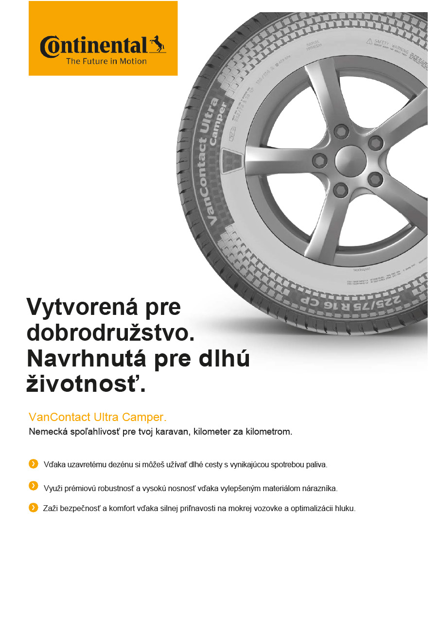 Pneumatika VanContact Ultra Camper je vyrobená pre skutočné nároky cestovania v obytnom vozidle. Vďaka silnejším gumovým blokom, ochrannému rebru a mimoriadne odolnej bočnici je viac než len vhodným súperom na každodenné opotrebenie – od kontaktu s obrubníkom až po štrkové cesty. Odoláva poškodeniu a oderu, takže sa môžeš sústrediť na cestu pred sebou. Vďaka silnej priľnavosti za mokra a dizajnu s optimalizovaným hlukom poskytuje táto pneumatika tichú a sebavedomú jazdu – kombinuje bezpečnosť a pohodlie na každej ceste, ktorú si vyberieš.