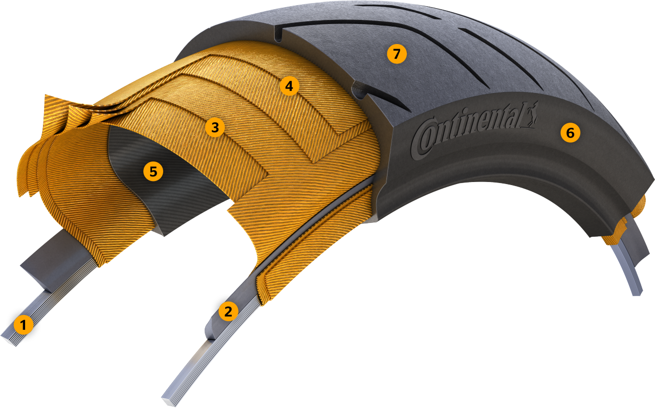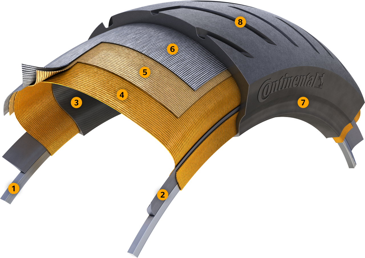 Radial tires feature a casing angle of approx. 90° to the circumferential direction (direction of travel) and a belt angle of 0°. The belt, located under the tread area, gives the tire stability and permits far higher speeds, as the centrifugal force deformation is subsantially lower. Reduced material thickness in the sidewall section means the tire heats up less and the high speed strenght is futher increased.