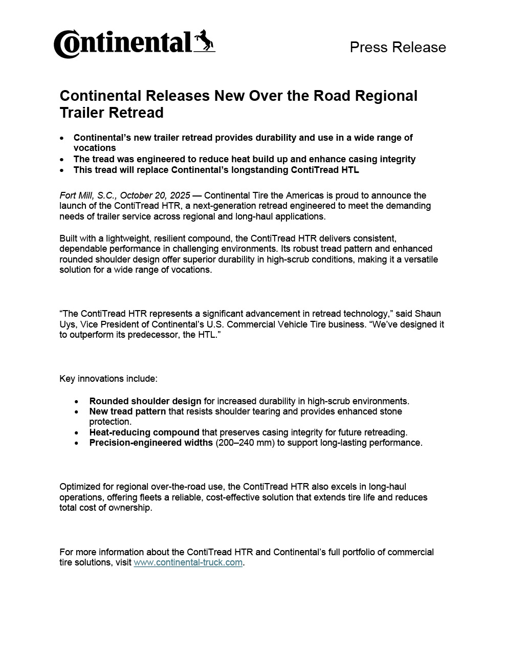 For more information about the ContiTread HTR and Continental’s full portfolio of commercial tire solutions, visit www.continental-truck.com.