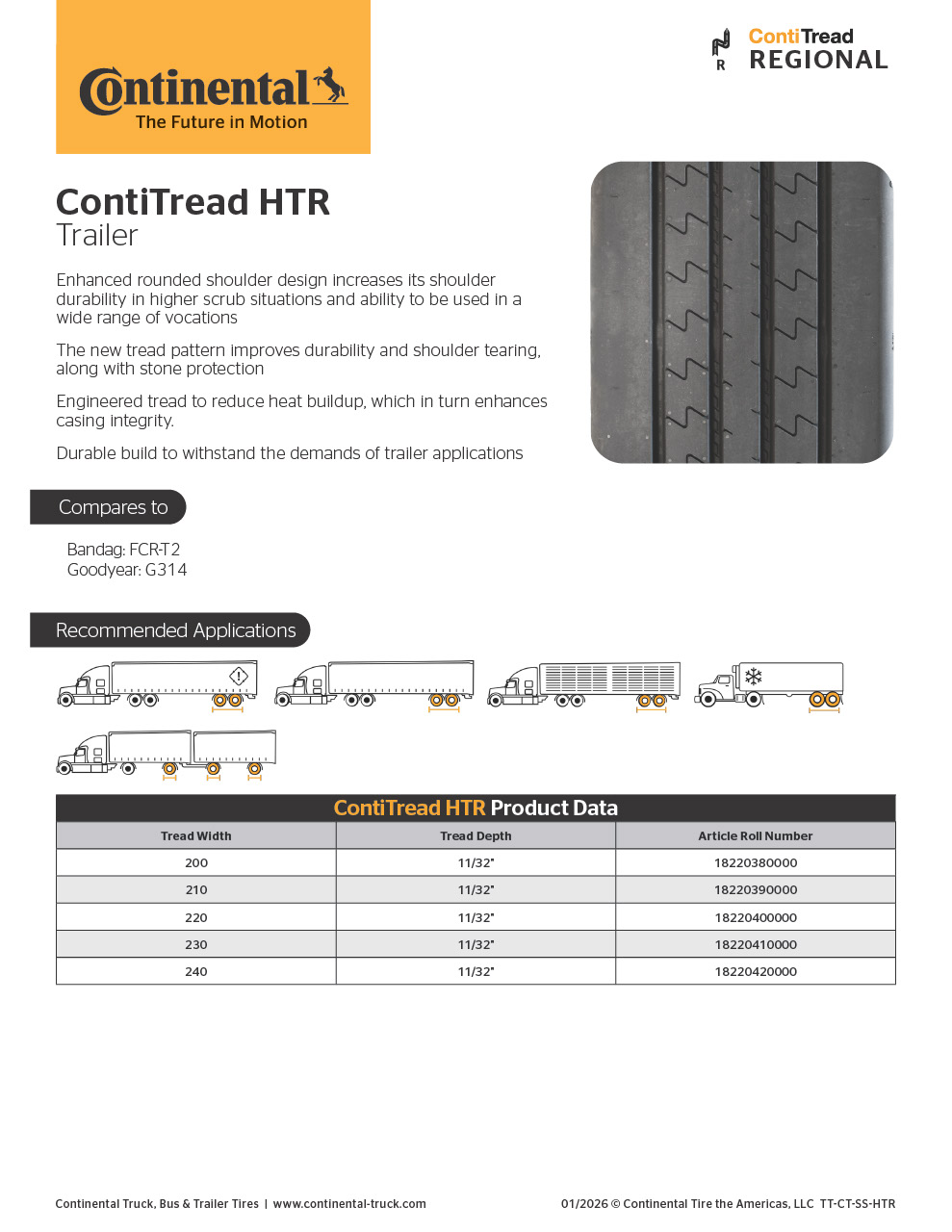 The ContiTread HTR is a durable retread designed to withstand the rigorous demands of trailer service. Engineered with a lightweight, resilient compound, it delivers consistent, dependable performance across challenging environments.