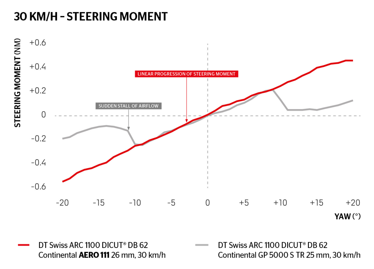 The sailing effect (forward acting force) increases. Even with lower rim profiles the rider benefits from this effect because the laminar airflow stays adjacent to the rim for a longer time. Thus, decreasing aerodynamic drag of the wheel-tire system at all speeds.