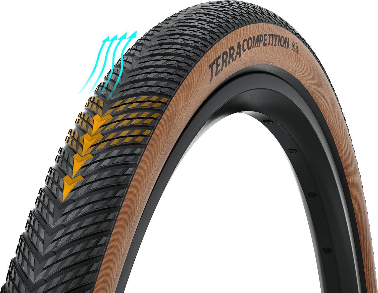 TERRA Competition is designed for fast gravel applications, featuring a light-knobbed tread pattern suited for light gravel, compressed soils and rough, worn-out tarmac in dry to moist conditions.