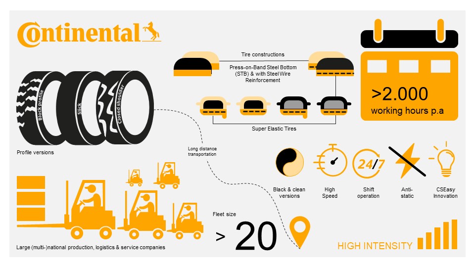 Industrial tires are subject to heavy loads and continuous operation. Continental offers reliable tire solutions for demanding, high-intensity material handling applications that require high mileage, endurance and durability. With their excellent mileage and low rolling resistance, Continental’s premium brand tires are particularly suitable for forklifts and other industrial vehicles used in 24/7 shift operation. Continental material handling tires are characterized by their robustness and durability and ensure maximum efficiency – ideal for long-distance transport and the requirements of large (multi-)national production, service and logistics companies.
